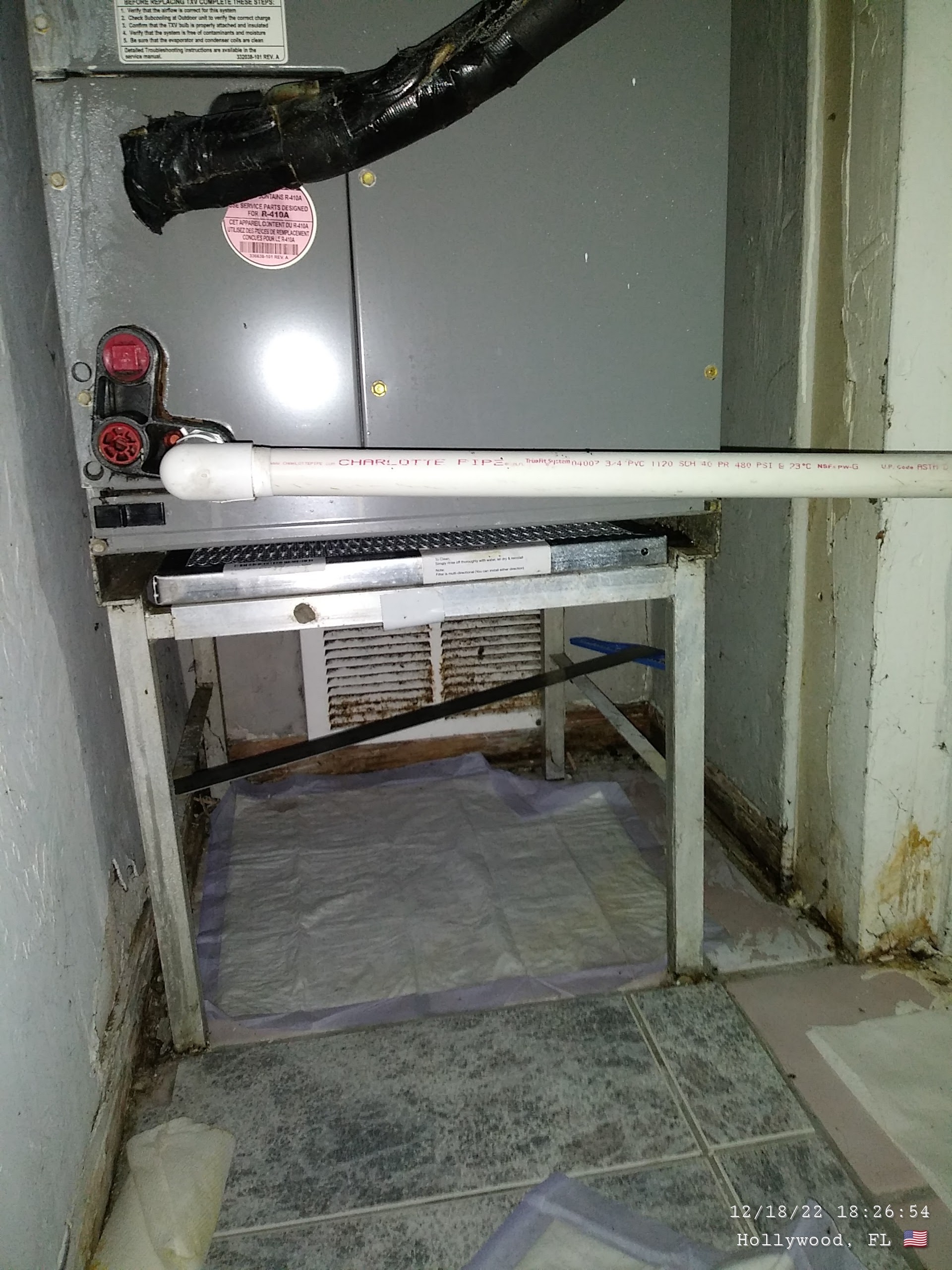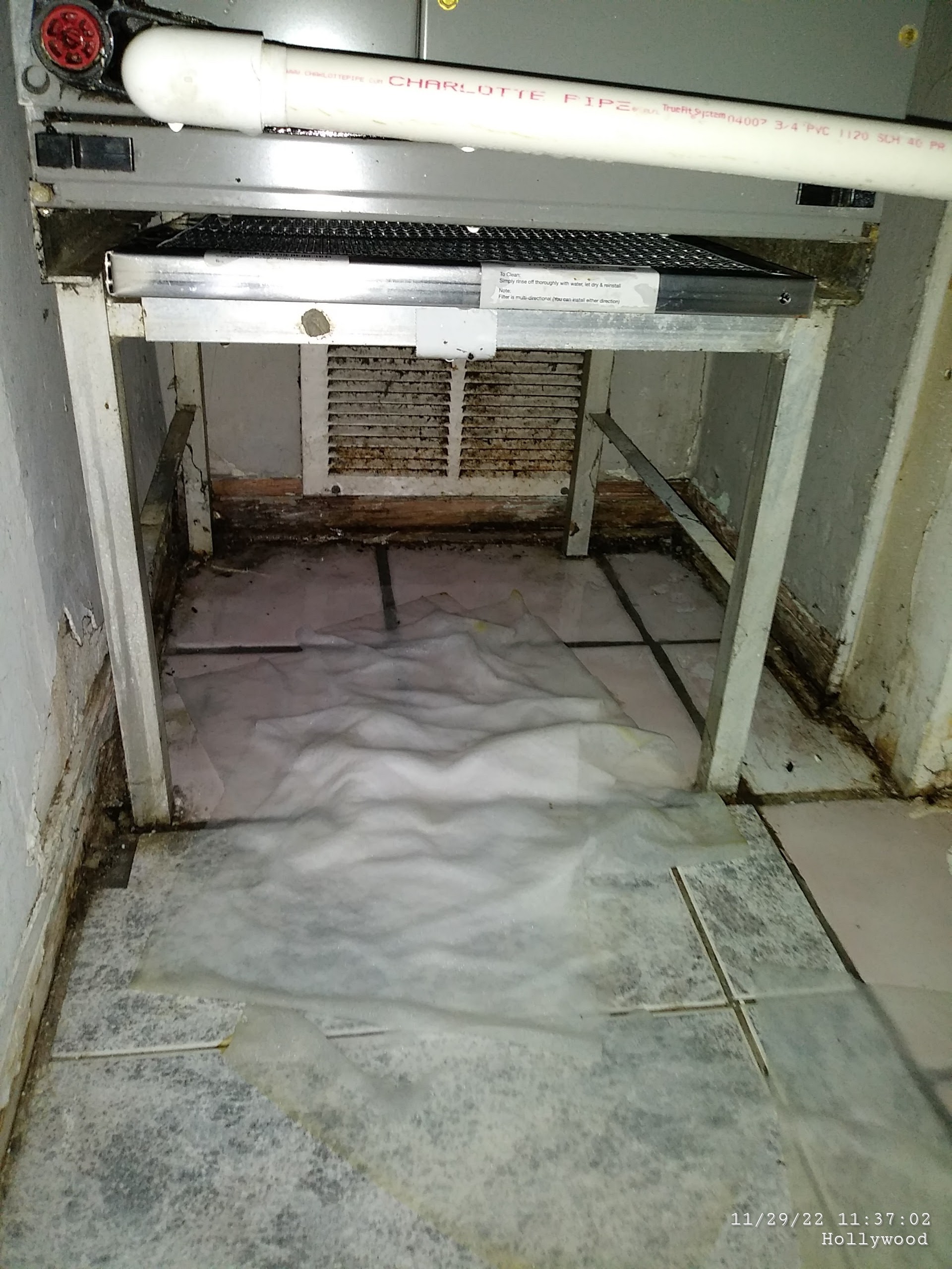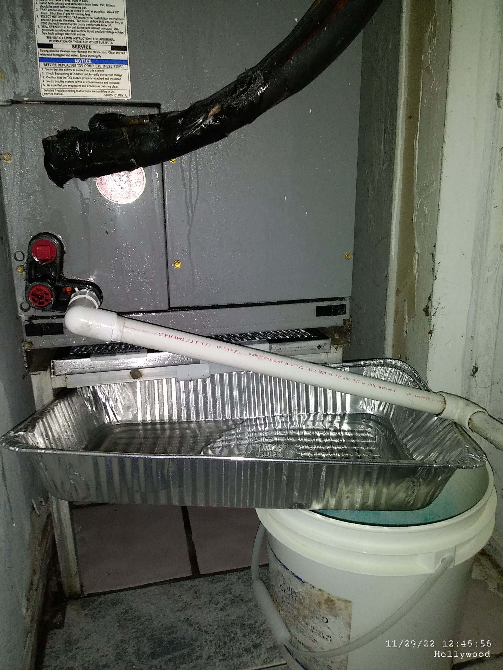I took action by cleaning the AC, buying pee pads, a UVC light, and a $53 filter. This task took about a month. The blue stuff in the bucket is toilet tablets, which is what I used to handle the mold growing on this water. Since 2018, I have tried many things to handle the leaking pipes including using my own plumber’s tape, adding plastic to the closet floor, and a ton of shenanigans to absorb the leaking. The yellow “tint” is grease from the dirty air coming out of the unit which soaked into the floor and the plastic I put on the closet ground.