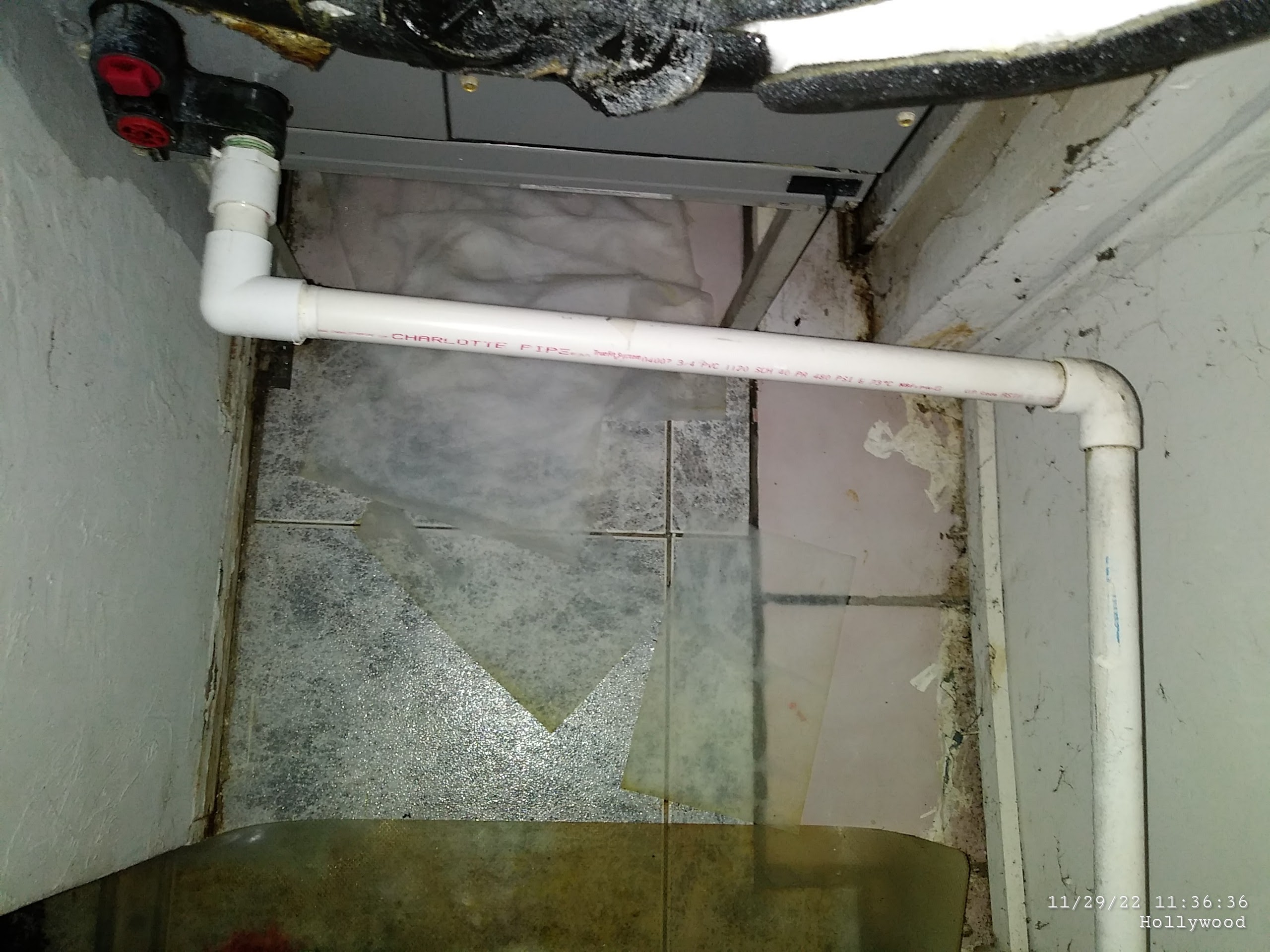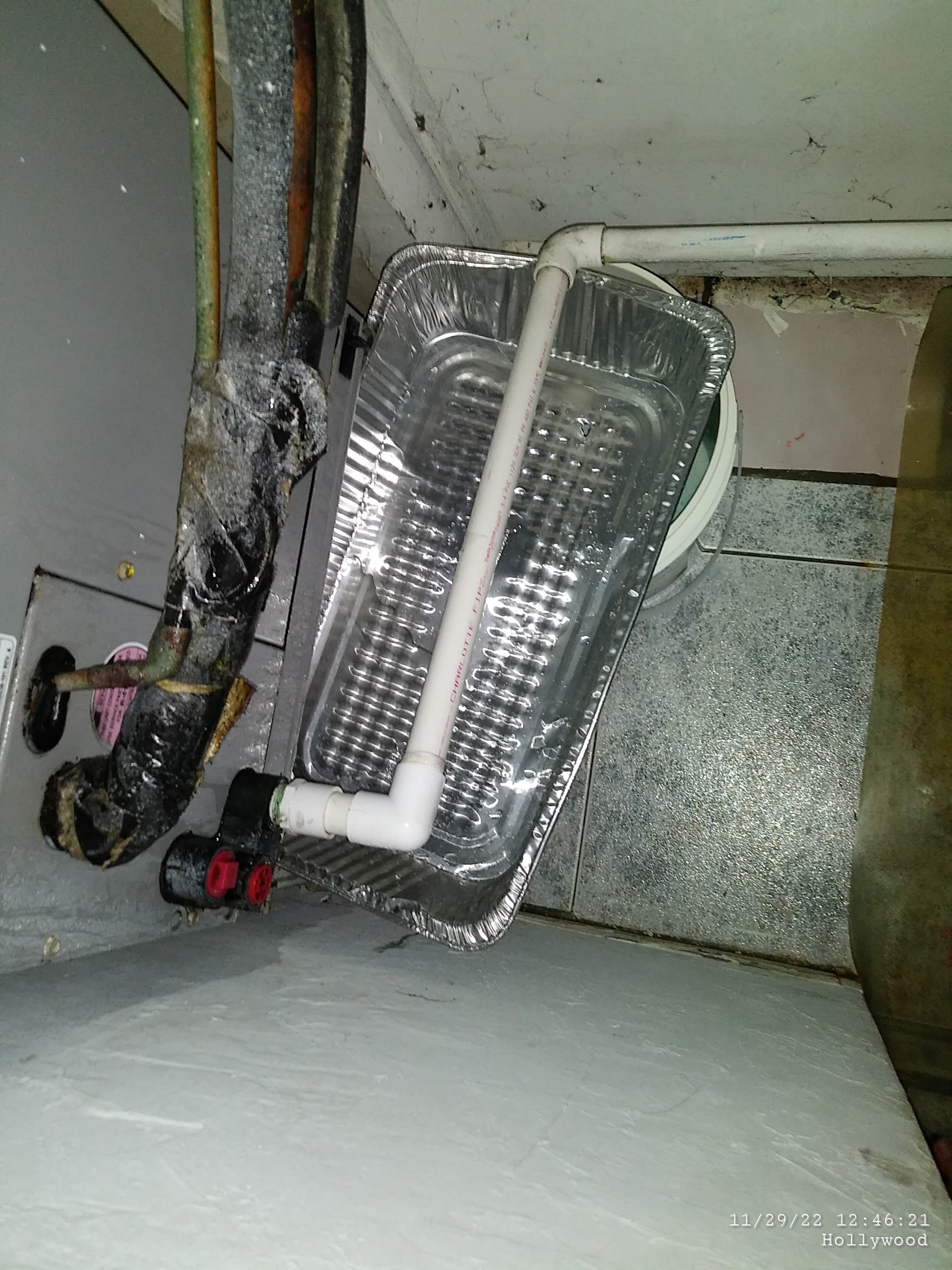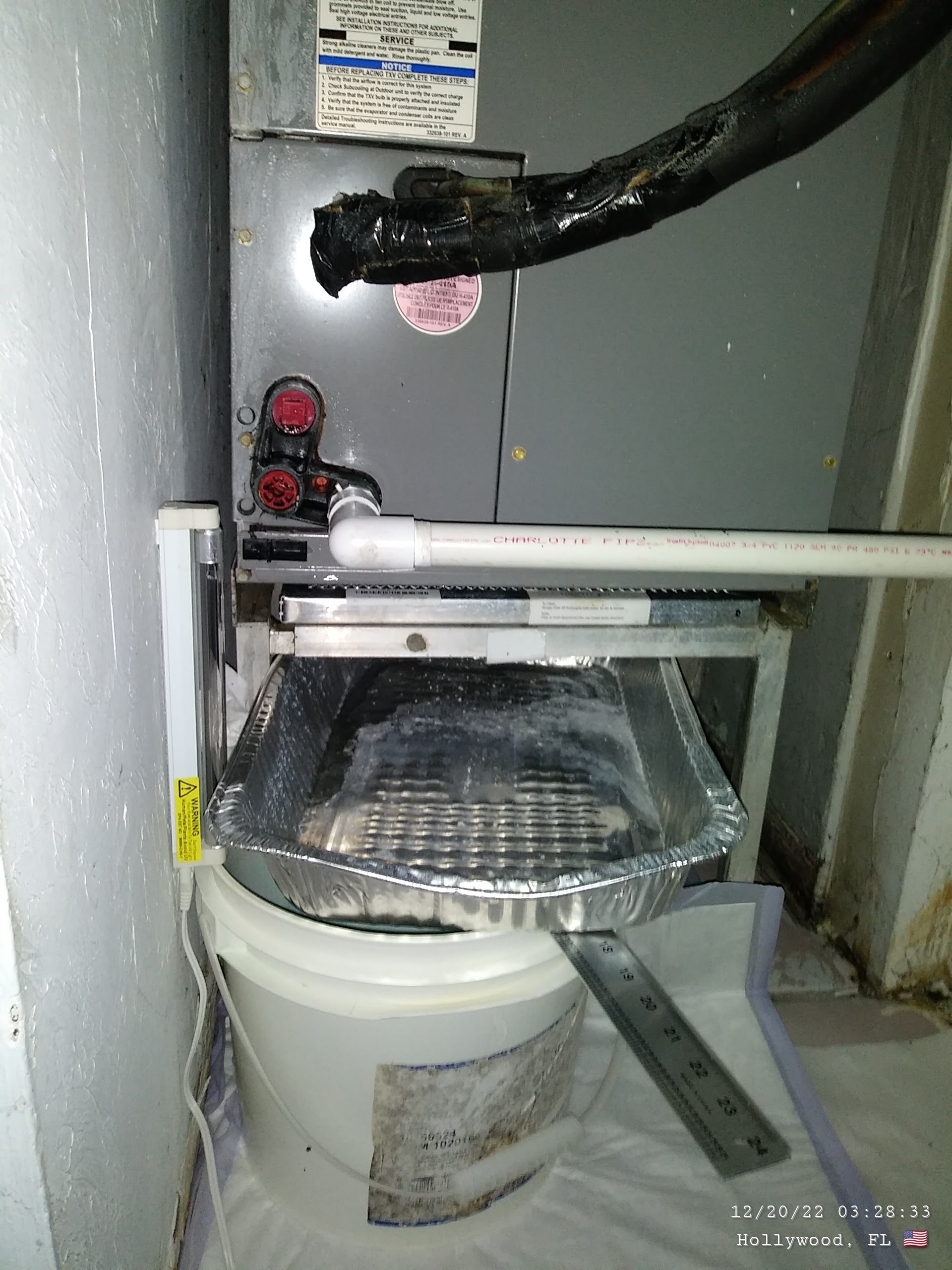 I took action by cleaning the AC, buying pee pads, a UVC light, and a $53 filter. This task took about a month. The blue stuff in the bucket is toilet tablets, which is what I used to handle the mold growing on this water. Since 2018, I have tried many things to handle the leaking pipes including using my own plumber’s tape, adding plastic to the closet floor, and a ton of shenanigans to absorb the leaking. The yellow “tint” is grease from the dirty air coming out of the unit which soaked into the floor and the plastic I put on the closet ground.