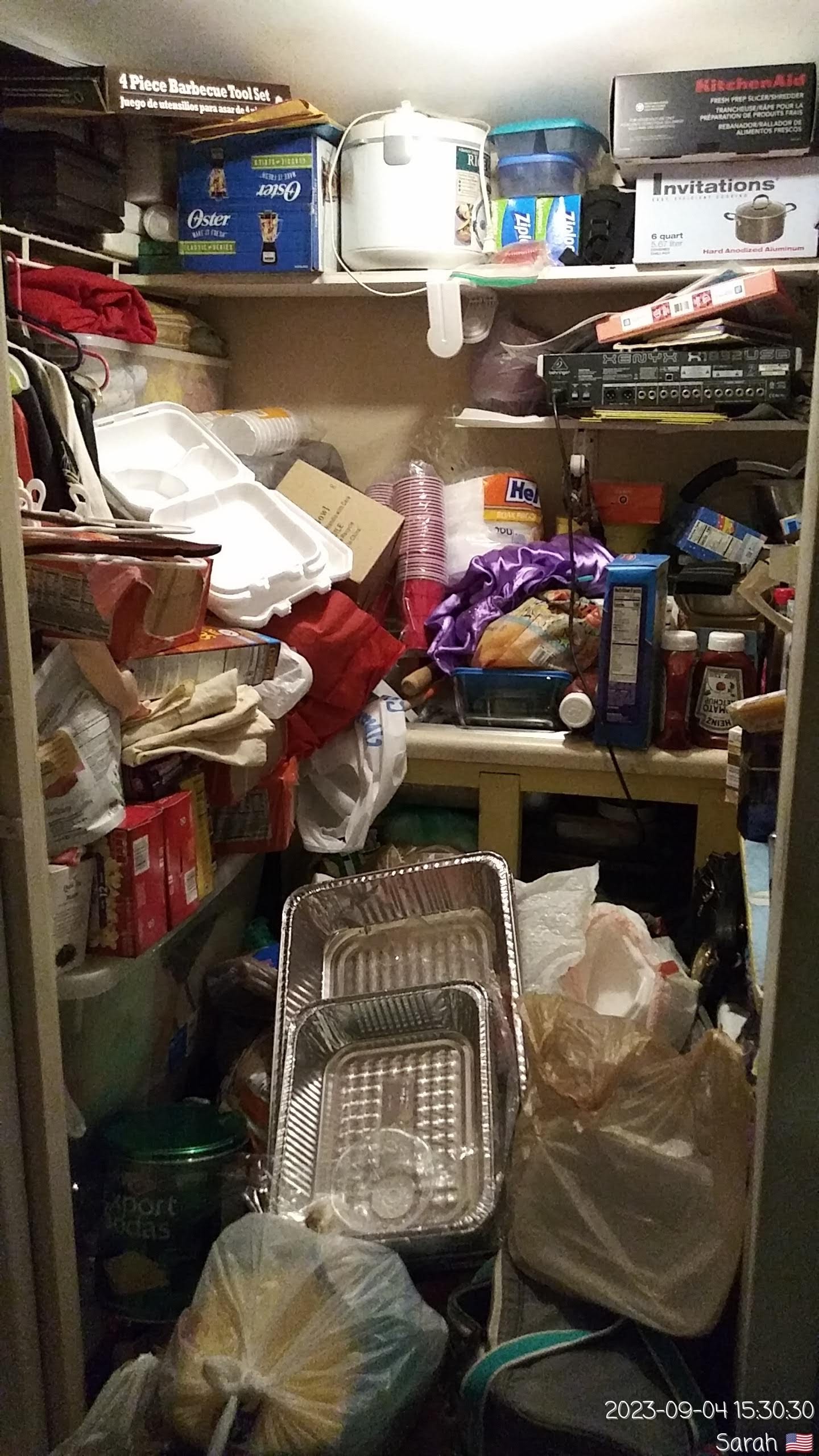 The slideshow below shows how we’ve had to store food and our kitchen items. Mainly everything is being stored outside of the house on the patio and in the “2nd kitchen”. What I refer to as the “2nd Kitchen”, is just a closet with floating counters that could be uninstalled to become a closet for clothes again.
